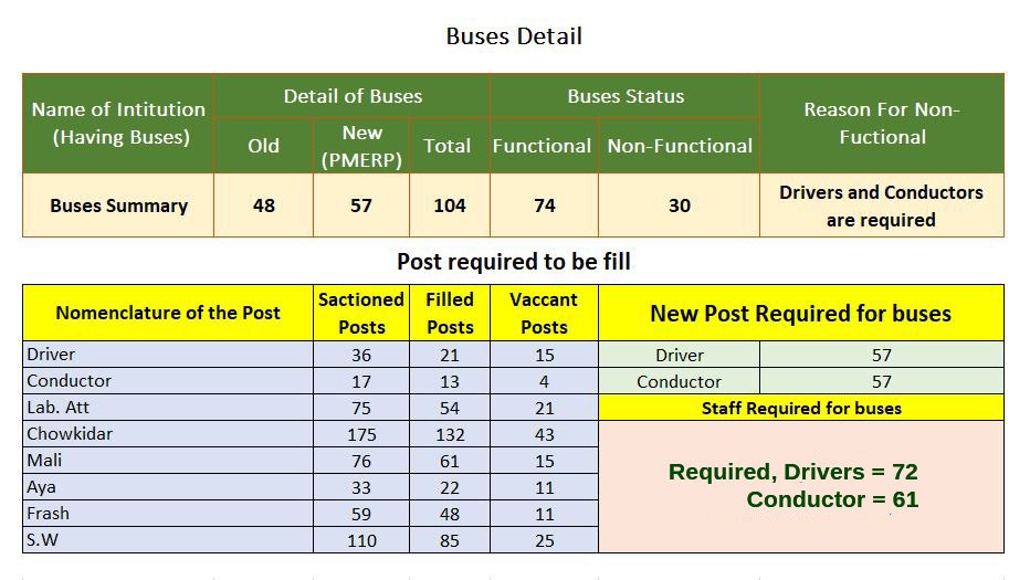 4). Buses provide to Institutions (under PM Reform program) with out budget. So, the proper budget with drivers and conductors should be provided, otherwise, they are not beneficial for students and institution.